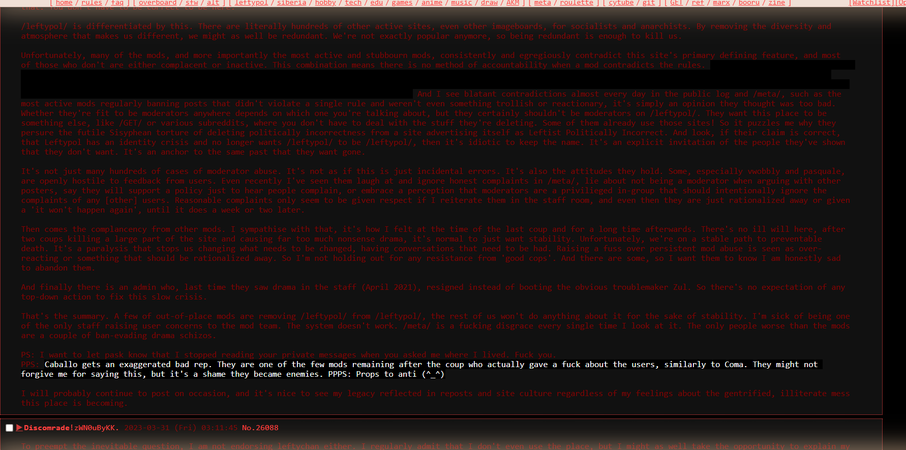 [ home / overboard / sfw / alt / cytube] [ leftypol / b / WRK / hobby / tech / edu / ga / ent / music / 777 / posad / i / a / lgbt / R9K / dead ] [ meta ]